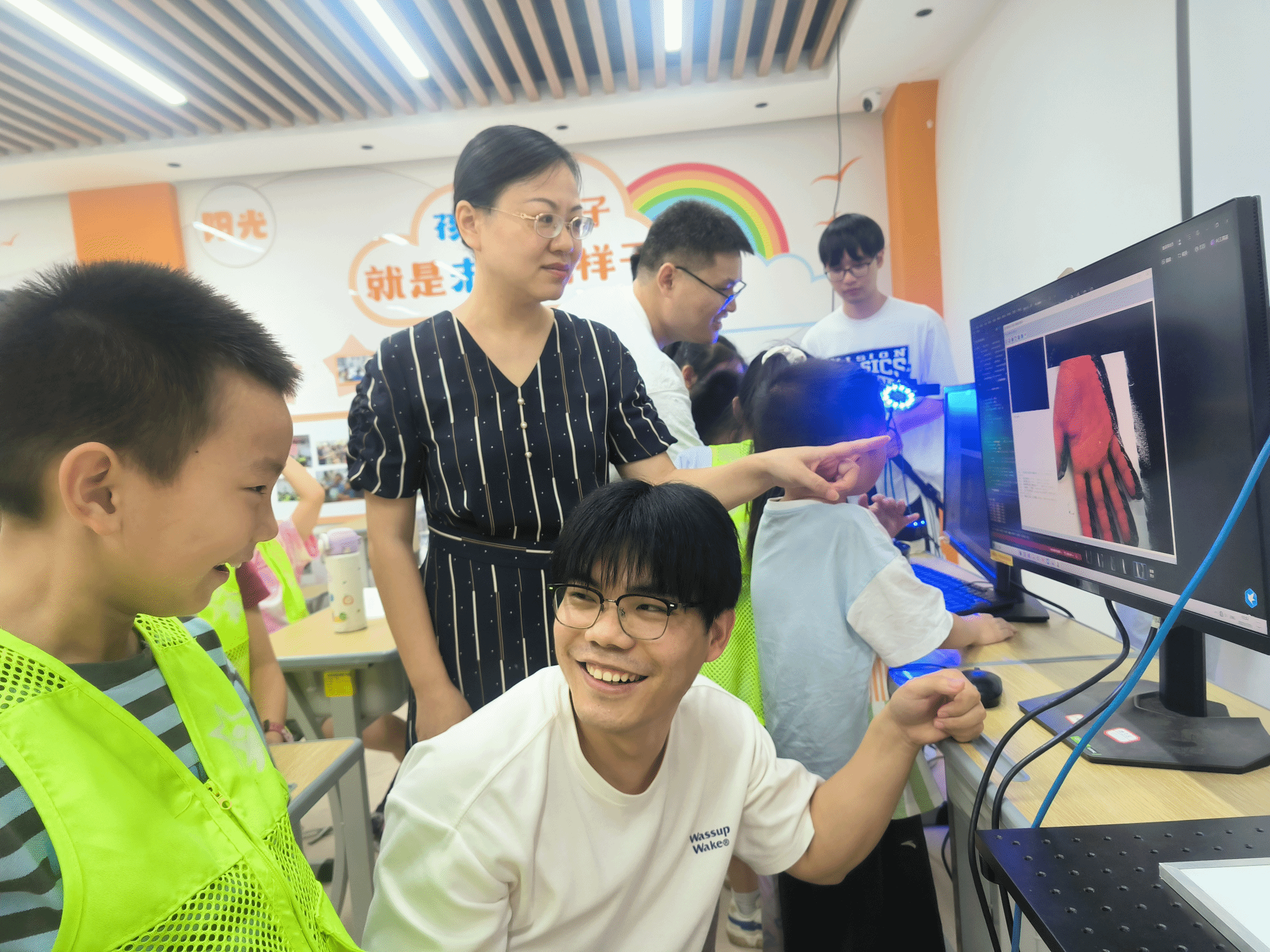陈艳菲从萝卜快跑等话题引入,启迪孩子们思考,用通俗易懂的语言介绍AI、三维成像等知识。活动现场,团队师生精心准备了趣味互动环节。孩子们通过“重建小手”体验了实时三维扫描技术的神奇,亲眼看到自己的小手被计算机瞬间“认出”。在三维成像体验区,大家争相围观通过特殊设备扫描的小物件后,屏幕上实时生成立体模型,并尝试了简单的虚拟旋转操作。团队成员耐心讲解原理,手把手指导操作,将抽象的前沿科技转化为看得见、摸得着的趣味体验。孩子们排队亲身体验,感受到科学的魅力。